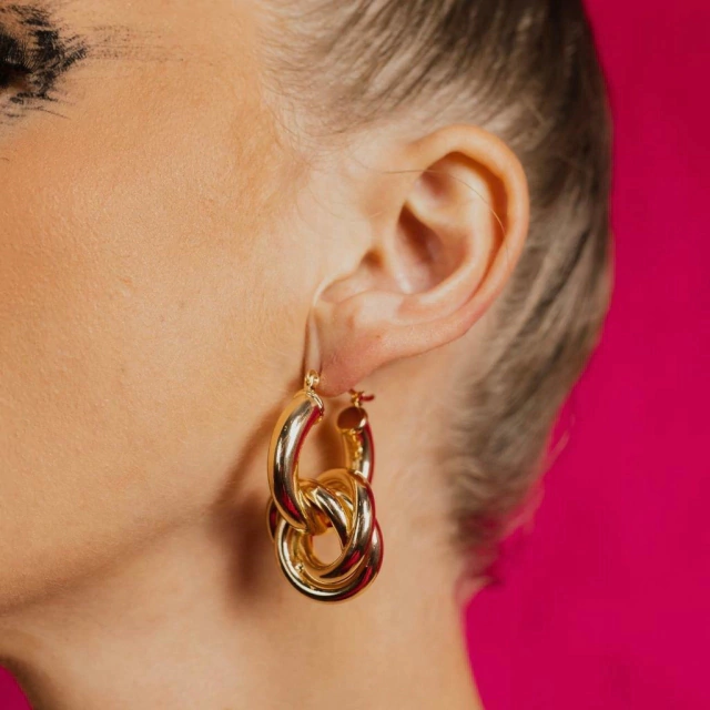 A Argola Upper é leve e com fecho italiano. Ambos lisos, porém o pingente possui elos trançados. A argola possui 3cm e o pingente 4cm de altura, totalizando 3cm. A argola pode ser utilizada com ou sem o adereço.