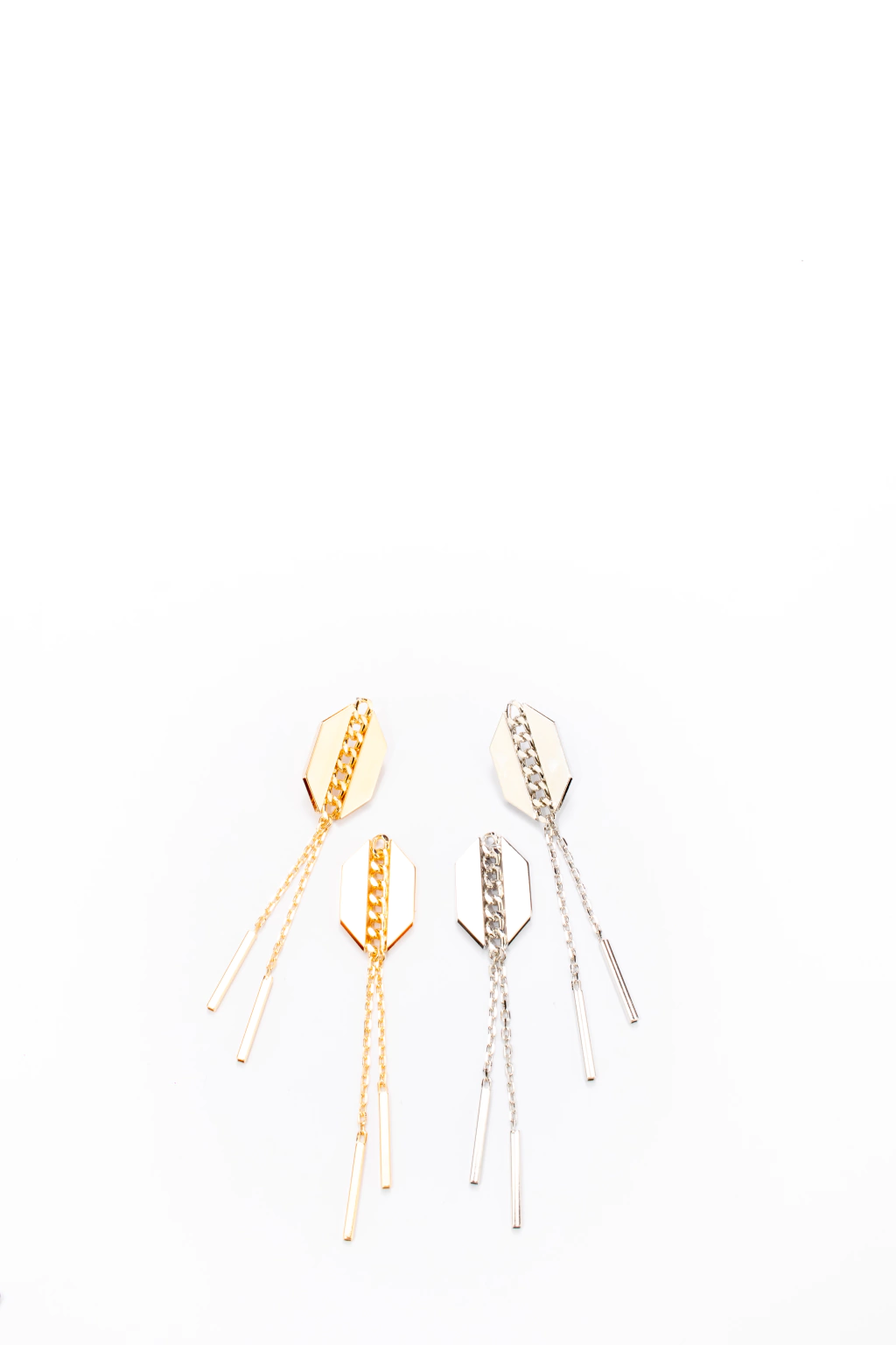 O Brinco Double Brony apresenta um design liso e correntaria, com 9 cm de altura e 1,5 cm de largura na parte lisa, onde está localizado o pino.