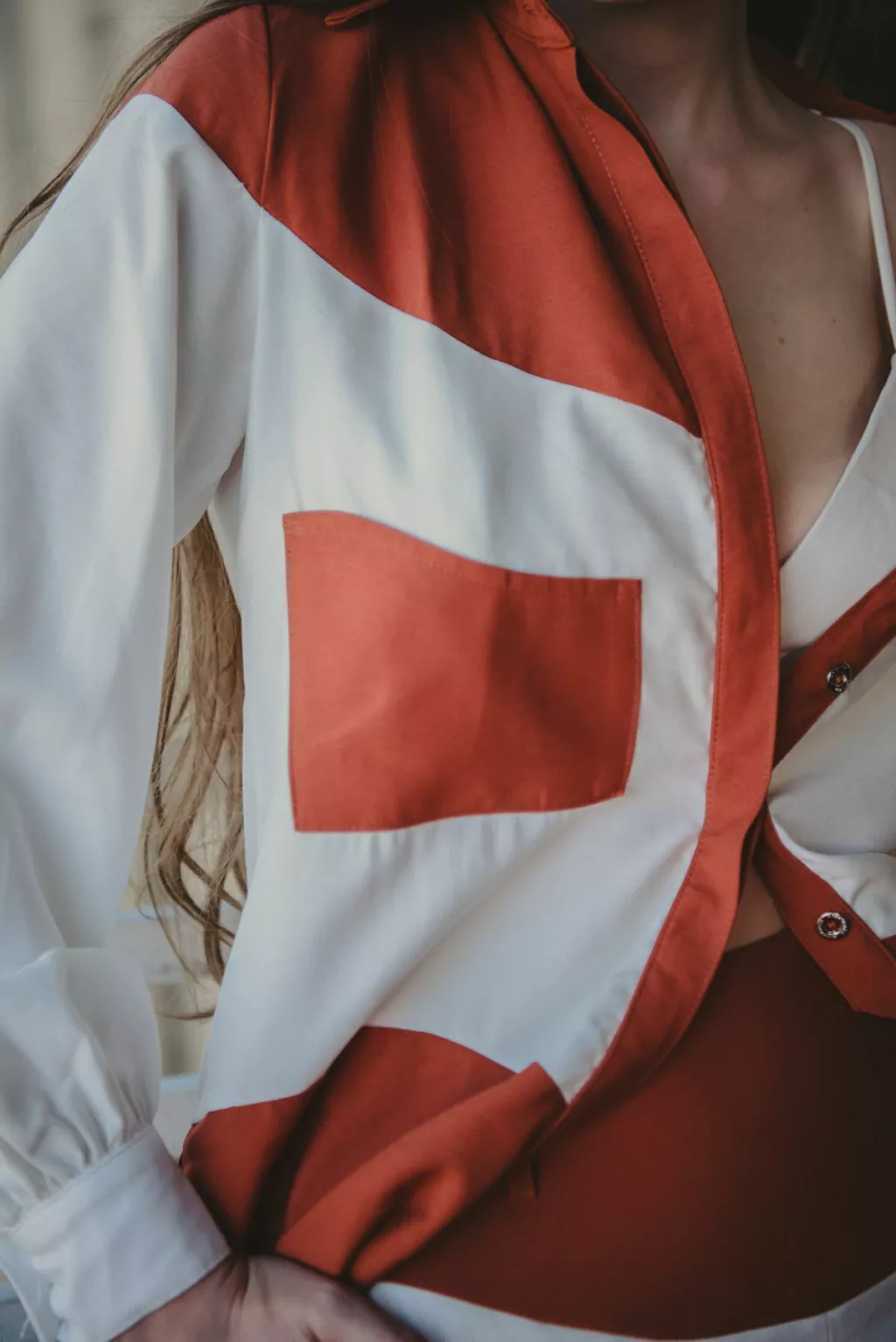 A Camisa Agora é uma peça feminina bicolor, com recortes orgânicos que conferem um toque contemporâneo. Feita de um tecido encorpado, o crepe de viscose, apresenta pate invisível e um fechamento frontal com botões personalizados.