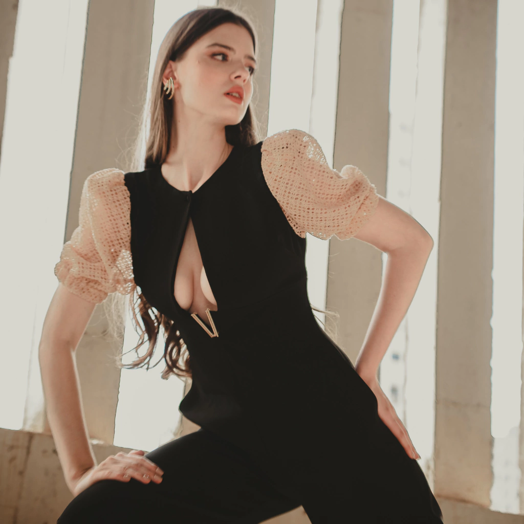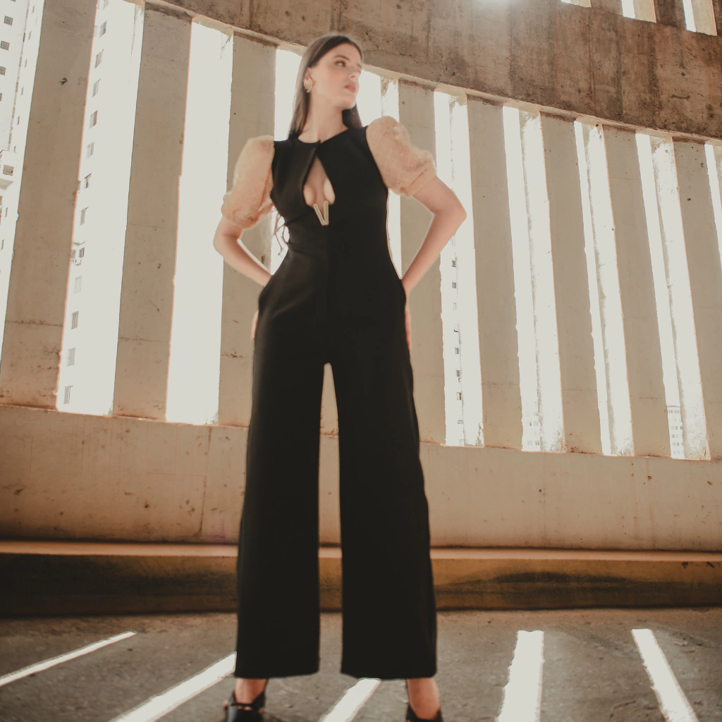 Com um decote V frontal, o macacão apresenta um fechamento delicado com pequeno botão forrado, enquanto o zíper traseiro proporciona praticidade ao vestir. A composição do tecido é de 90% poliéster e 10% elastano, garantindo conforto, flexibilidade e durabilidade ao vestuário. O Macacão Miragem é uma escolha refinada para ocasiões especiais.