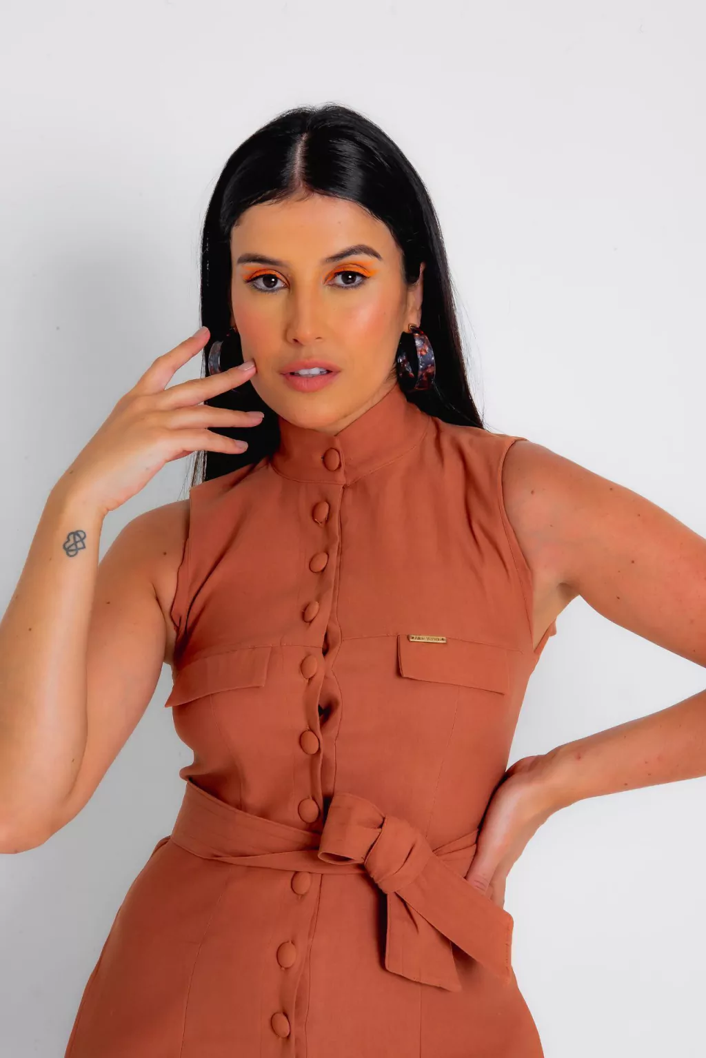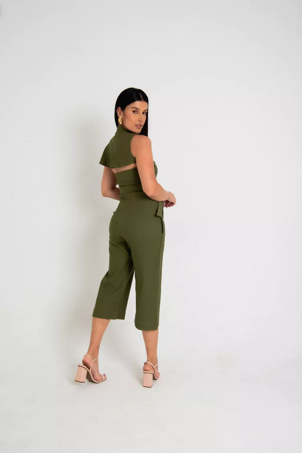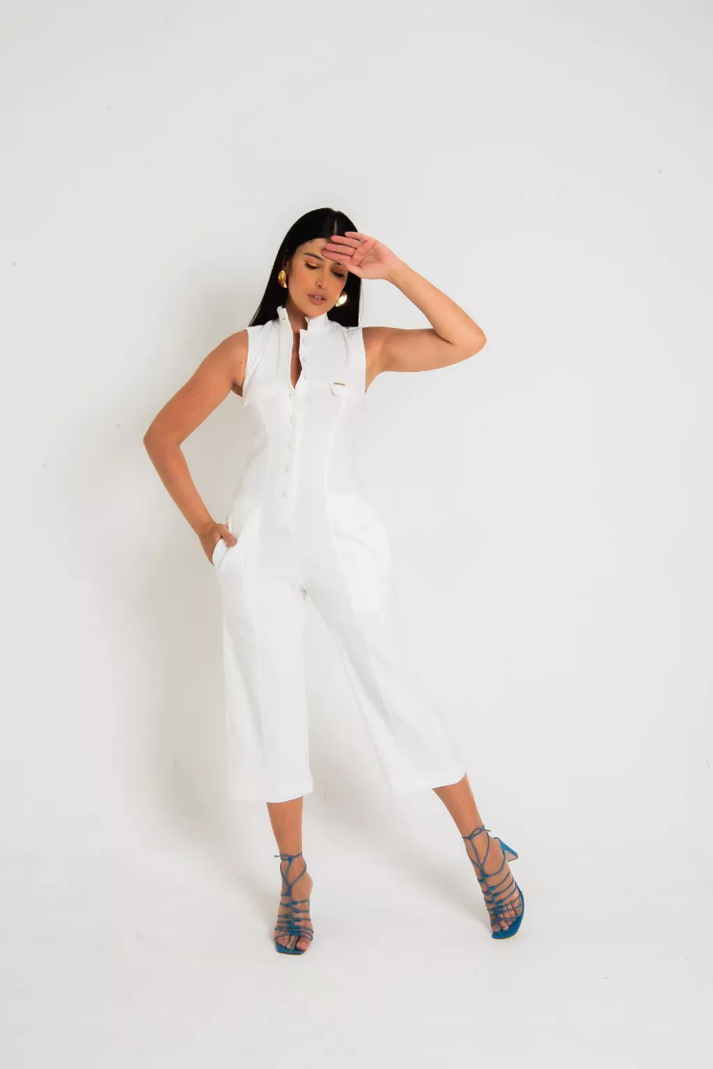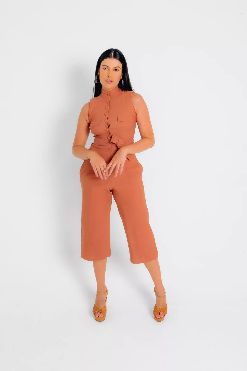 O "Macacão Natureza" é uma peça feminina com modelagem pantacourt, oferecendo um visual moderno e confortável. Possui abotoamento frontal com botões forrados, proporcionando um toque elegante. Disponível em cores lisas, o macacão apresenta um recorte na parte de trás para um detalhe extra.