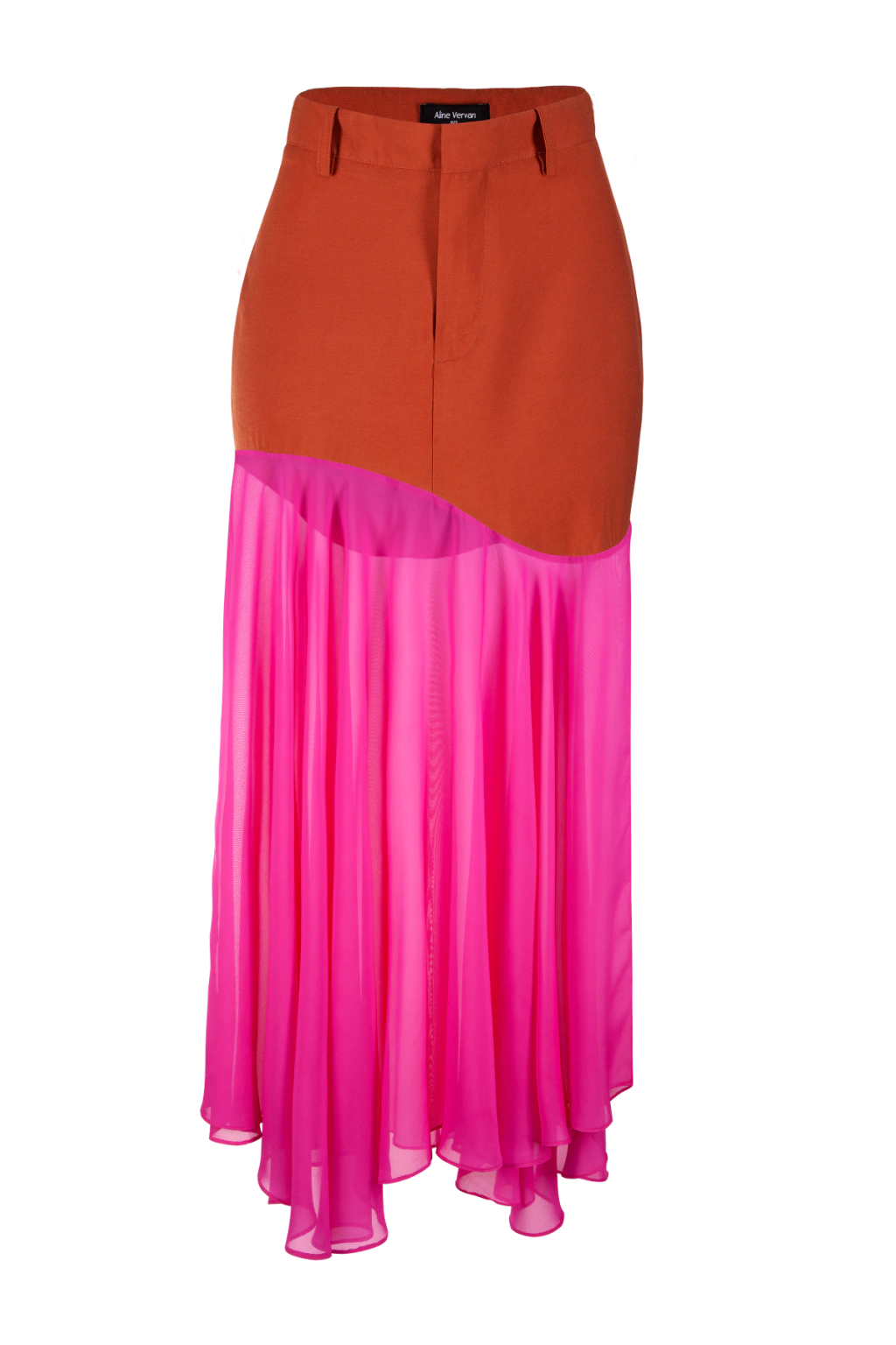 A Saia Singular é uma peça bicolor que combina dois tecidos creponados, um estruturado e outro fluido. Com uma modelagem do cós clássico da alfaiataria, seu fechamento é feito por colchetes e passantes estreitos. A inclusão de bolsos traseiros adiciona funcionalidade à peça, enquanto o detalheevasê oferece um caimento fluído.
