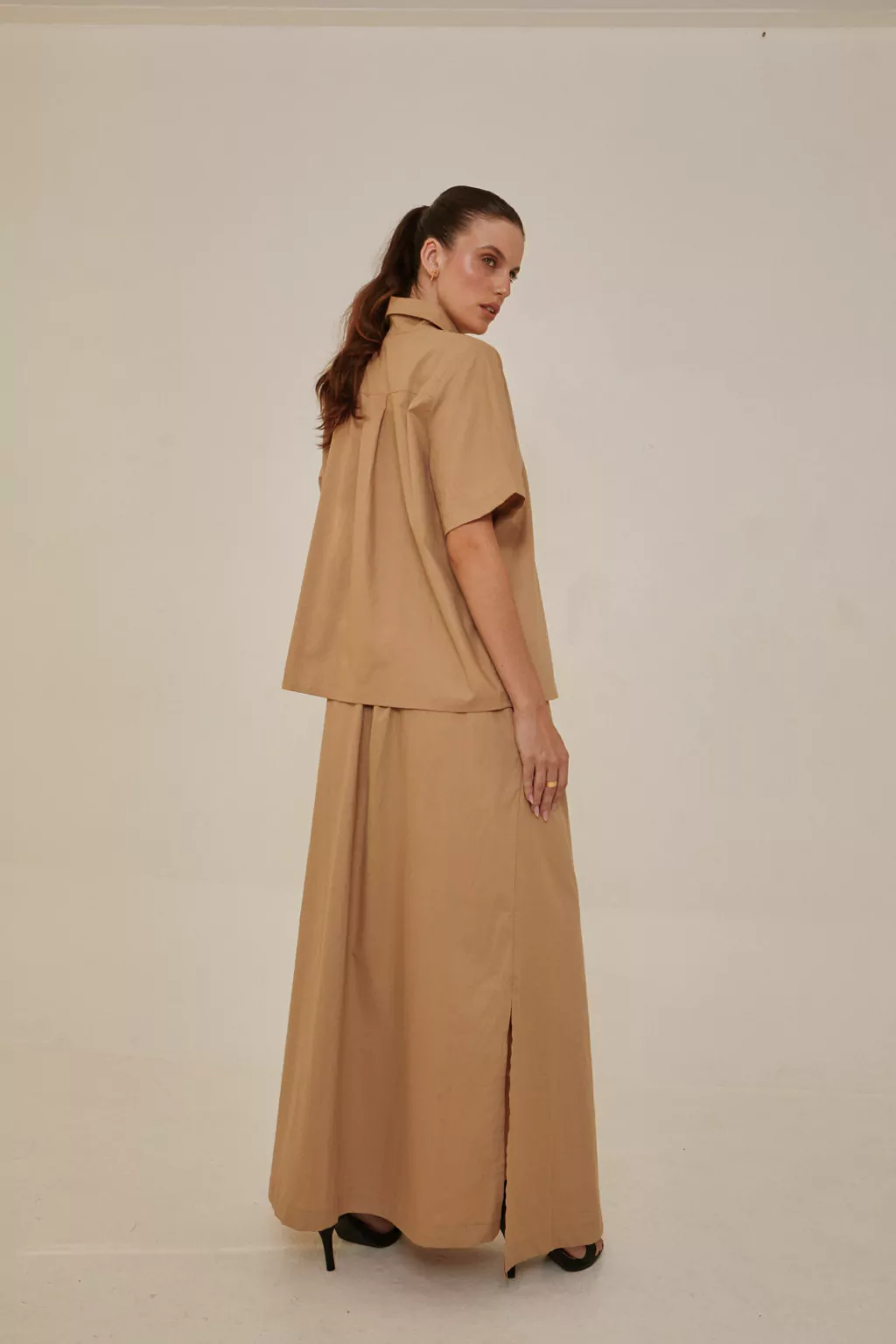 A Saia Brisa tem uma modelagem levemente evasê e longa, dando um visual clássico e atemporal. Aplicação de elástico no cós na parte traseira facilita a vestibilidade. A inclusão de bolsos faca adiciona um toque prático ao design, enquanto a faixa para amarração oferece uma opção de personalização no estilo. Para facilitar o vestir, a Saia Brisa possui um zíper lateral discreto. A fenda lateral não apenas contribui para a estética da peça, mas também permite uma maior liberdade de movimento. A composição do tecido é totalmente em algodão, assegurando um toque suave e agradável ao vestir.