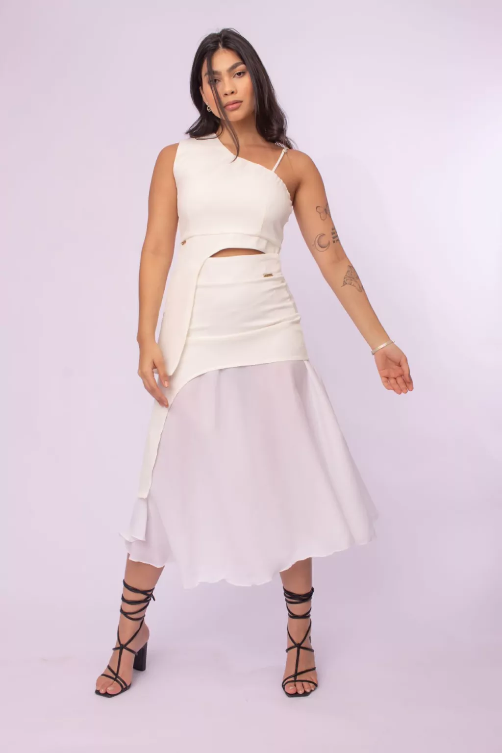 A Saia Midi Diana é uma peça que se destaca pela sua elegância e combinação de tecidos diferenciada. Com um duo de tecido, ela apresenta uma mistura equilibrada entre a sobriedade da alfaiataria e a leveza do crepe fluido.