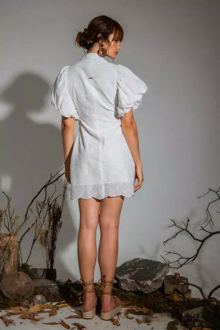 O vestido curto exibe mangas mega bufantes, conferindo-lhe um estilo distintivo. Elaborado em tecido bordado e forro liso, representa a essência da marca, incorporando detalhes inspirados em blazer, enquanto mantém um DNA ultra feminino. Uma fusão única de elementos que destaca a identidade única e elegante da peça.