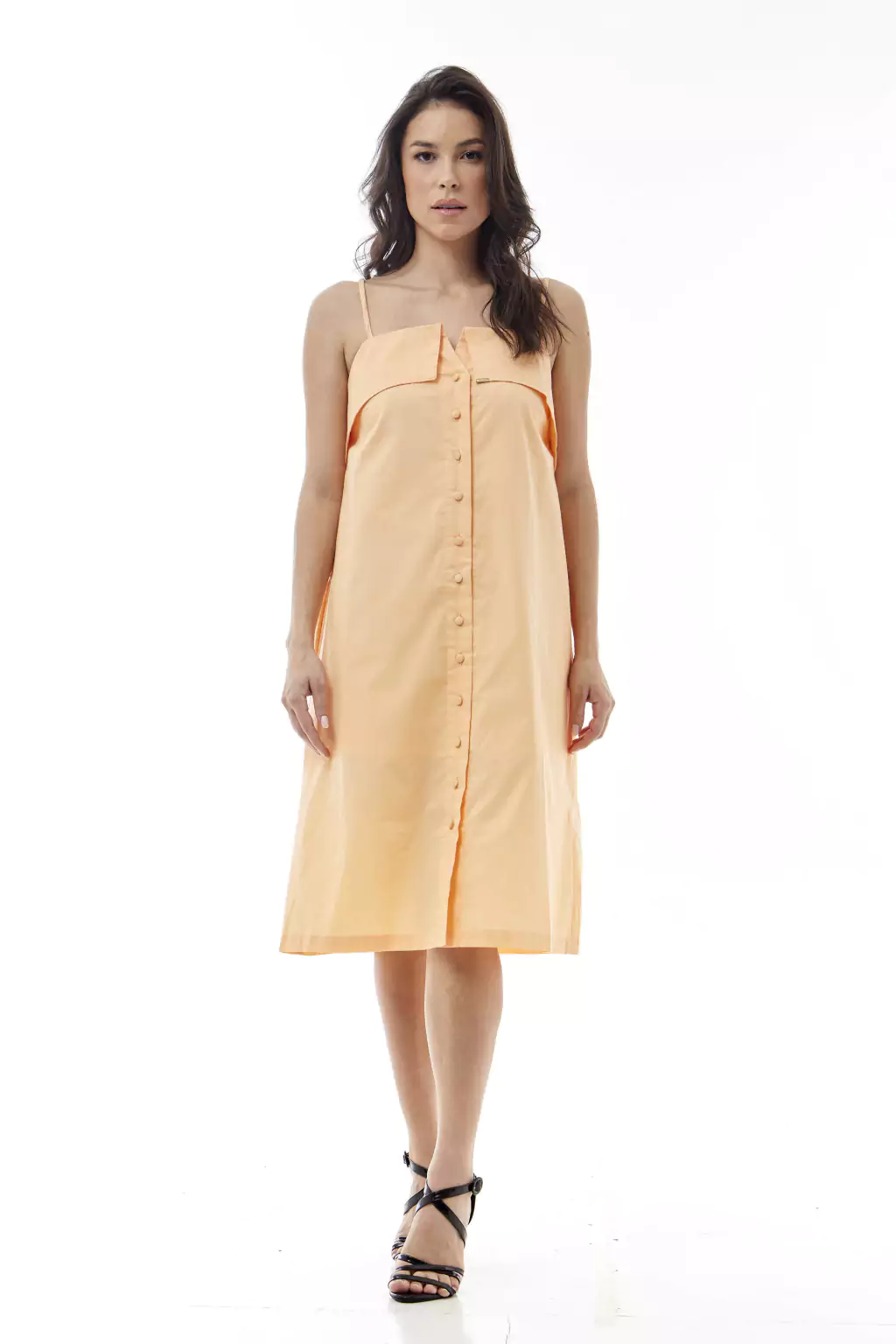 O Vestido Campos é uma peça de comprimento chanel. Modelagem levemente evasê, abotoamento frontal com botões forrados, alças finas sem regulador, aplicação de elástico na parte das costas, forrado, detalhe frontal com assimetria.