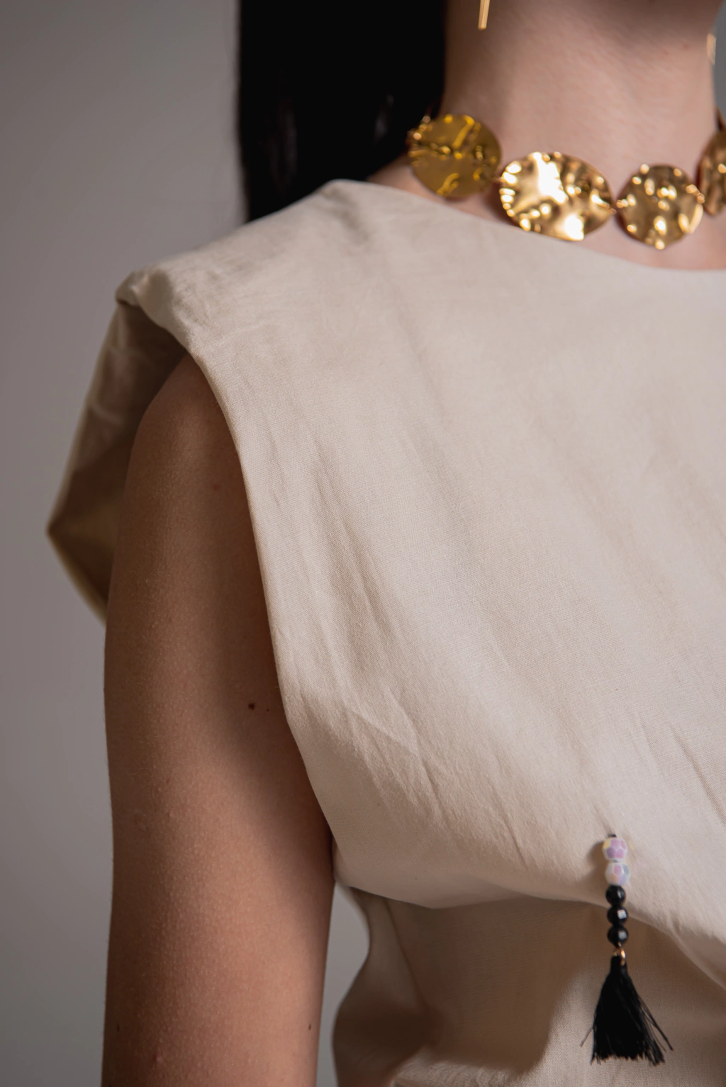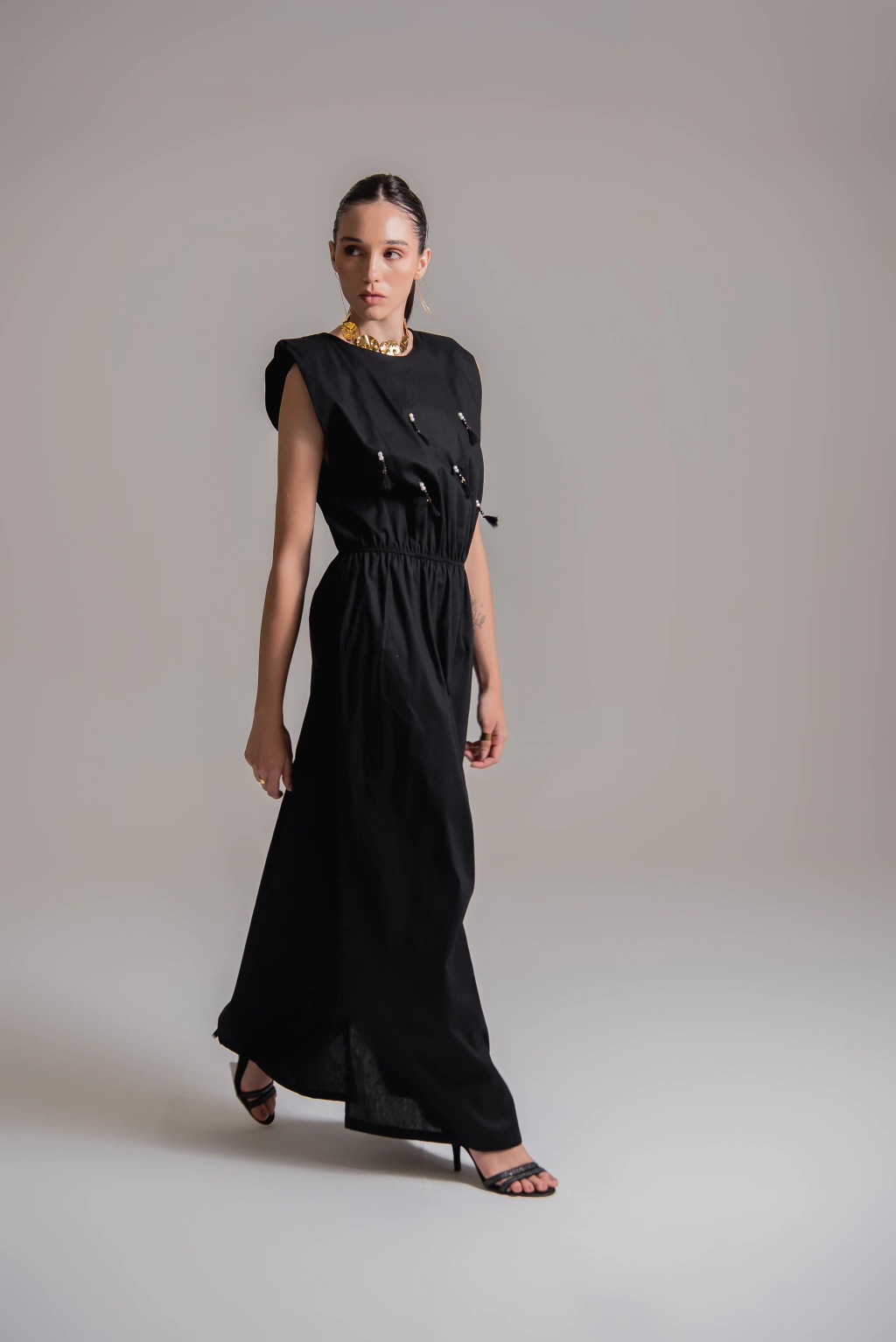 O Vestido longo Ária é todo confeccionado em tricoline 100% algodão com modelagem mais reta, mangas cavadas amplas, ombreiras, aplicação de elástico na cintura, fendas laterais e aplicações de pedras na parte superior da frente do vestido. Vestido sem forro e com toque leve e fresco, ideal para dias mais quentes.