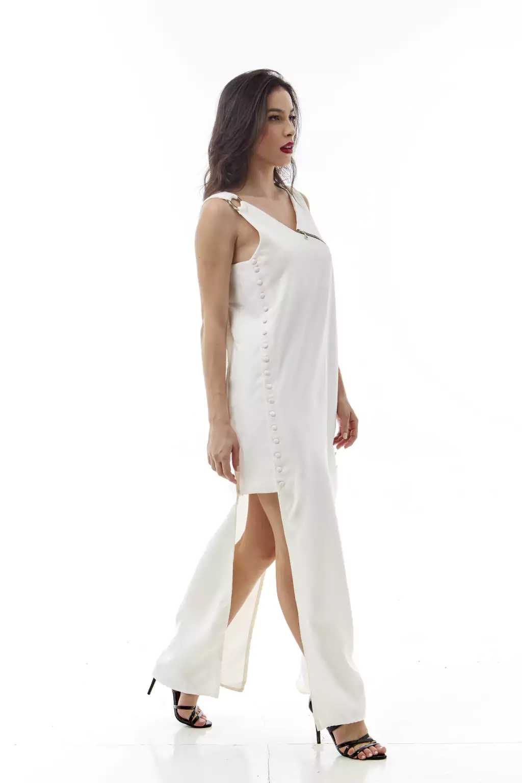 O Vestido Virgínia é uma peça que apresenta um design refinado com atenção aos detalhes. O abotoamento com botões forrados e o detalhe frontal com zíper de metal conferem um toque sofisticado. As alças assimétricas, destacando-se com argolas aplicadas, adicionam um elemento moderno à modelagem reta da peça.