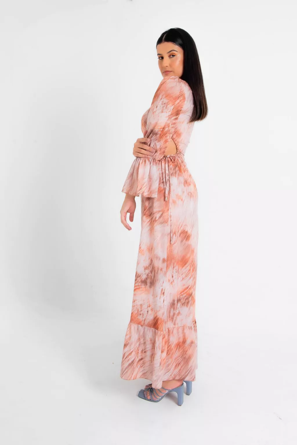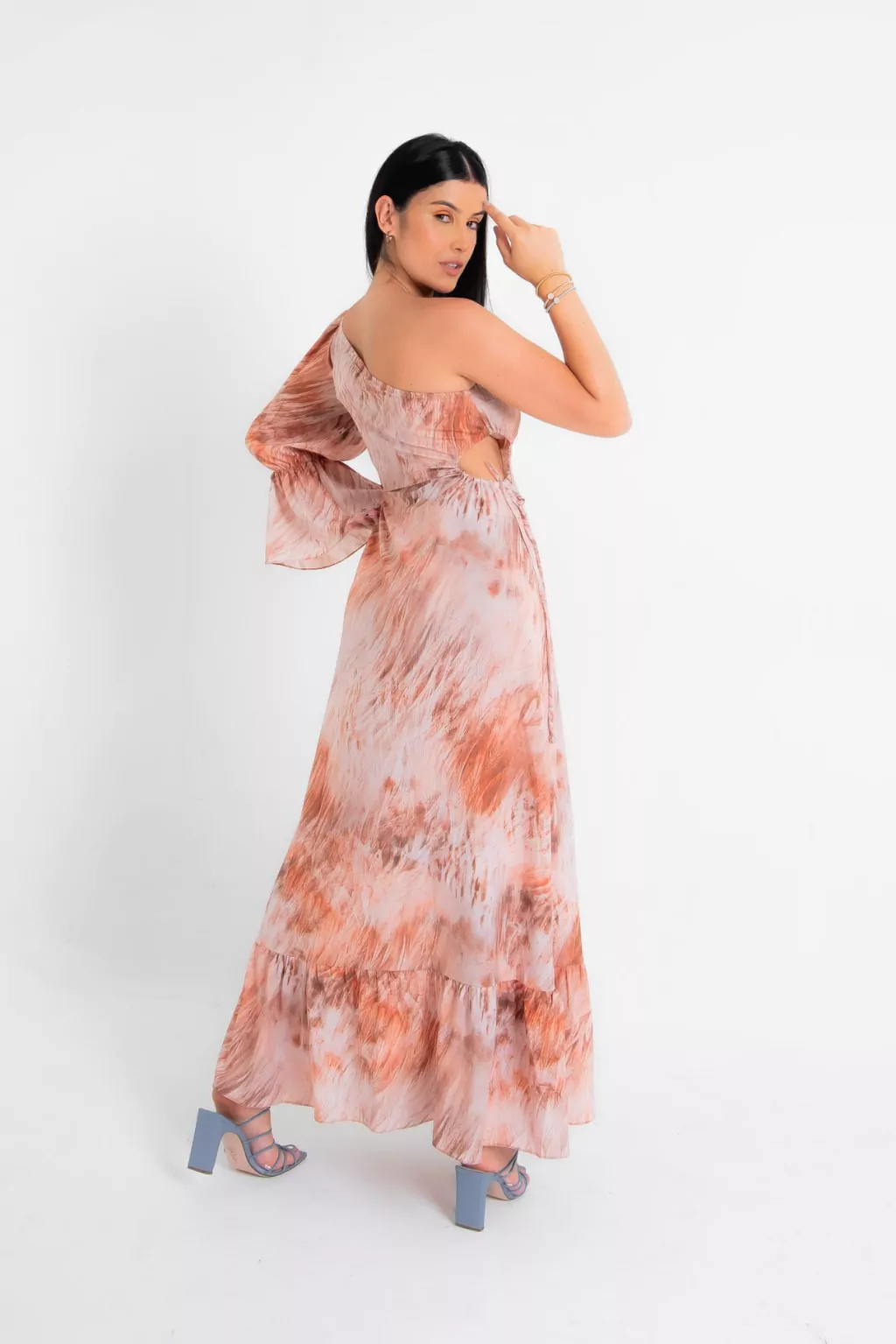 O vestido longo de ombro só é uma peça atemporal e versátil, ideal para diversas ocasiões, especialmente na sua mala de verão. Apresenta mangas longas, babado na barra, elástico no colo e vazado (recorte) nas laterais, proporcionando um toque moderno. Este vestido é uma peça componente da coleção cápsula "RAÍZES" e destaca-se pela sua estampa exclusiva, acrescentando um toque único ao seu estilo.