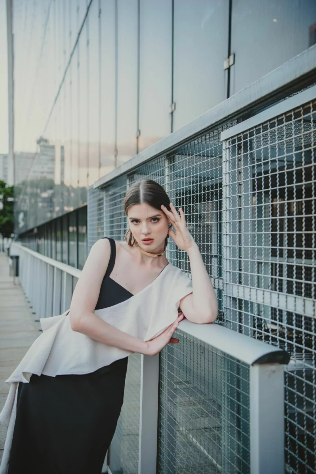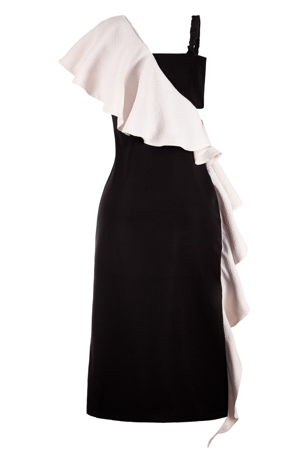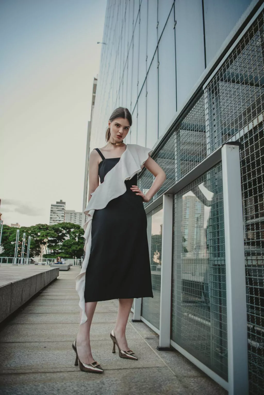 O Vestido Viver apresenta uma modelagem reta com recortes estratégicos que destacam sua originalidade. Uma fenda lateral adiciona um toque de elegância, enquanto a aplicação do babado em outro tecido traz um elemento de estilo contrastante. As alças assimétricas proporcionam um visual moderno e dinâmico, sem contar pelo conforto do elástico.