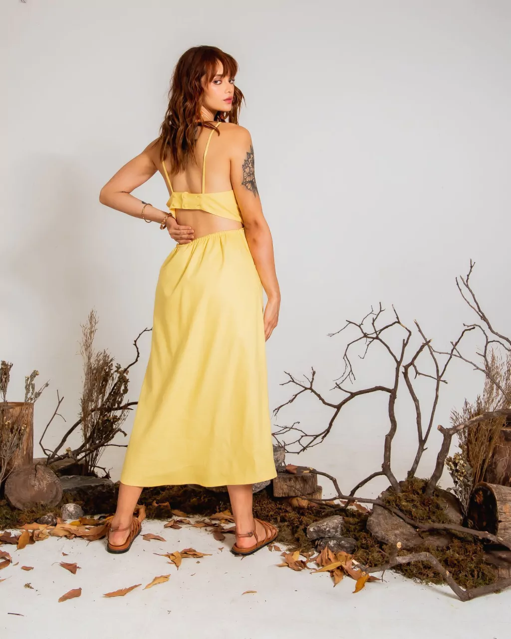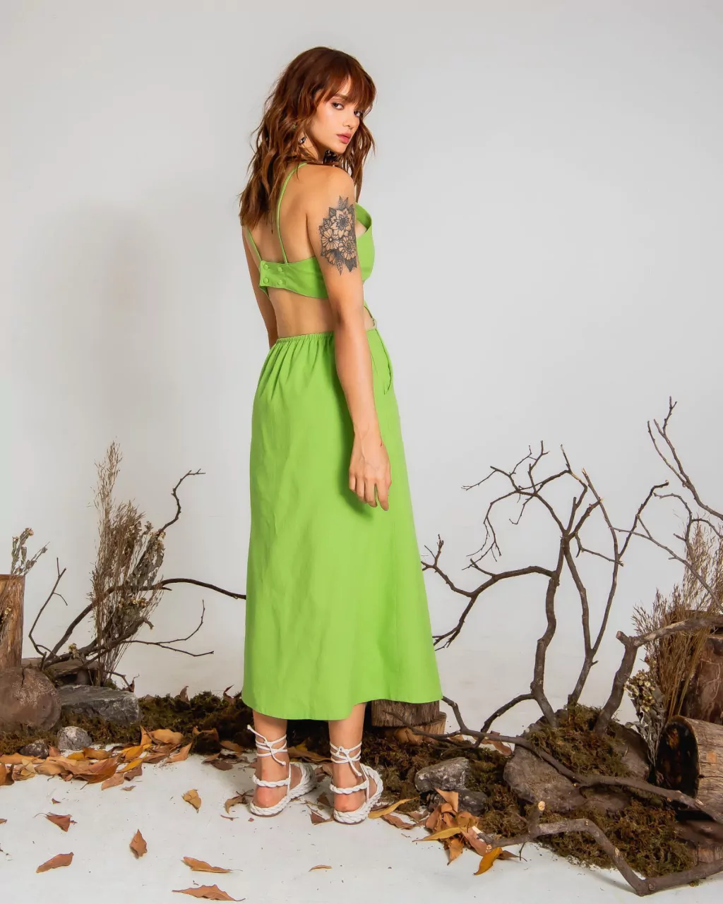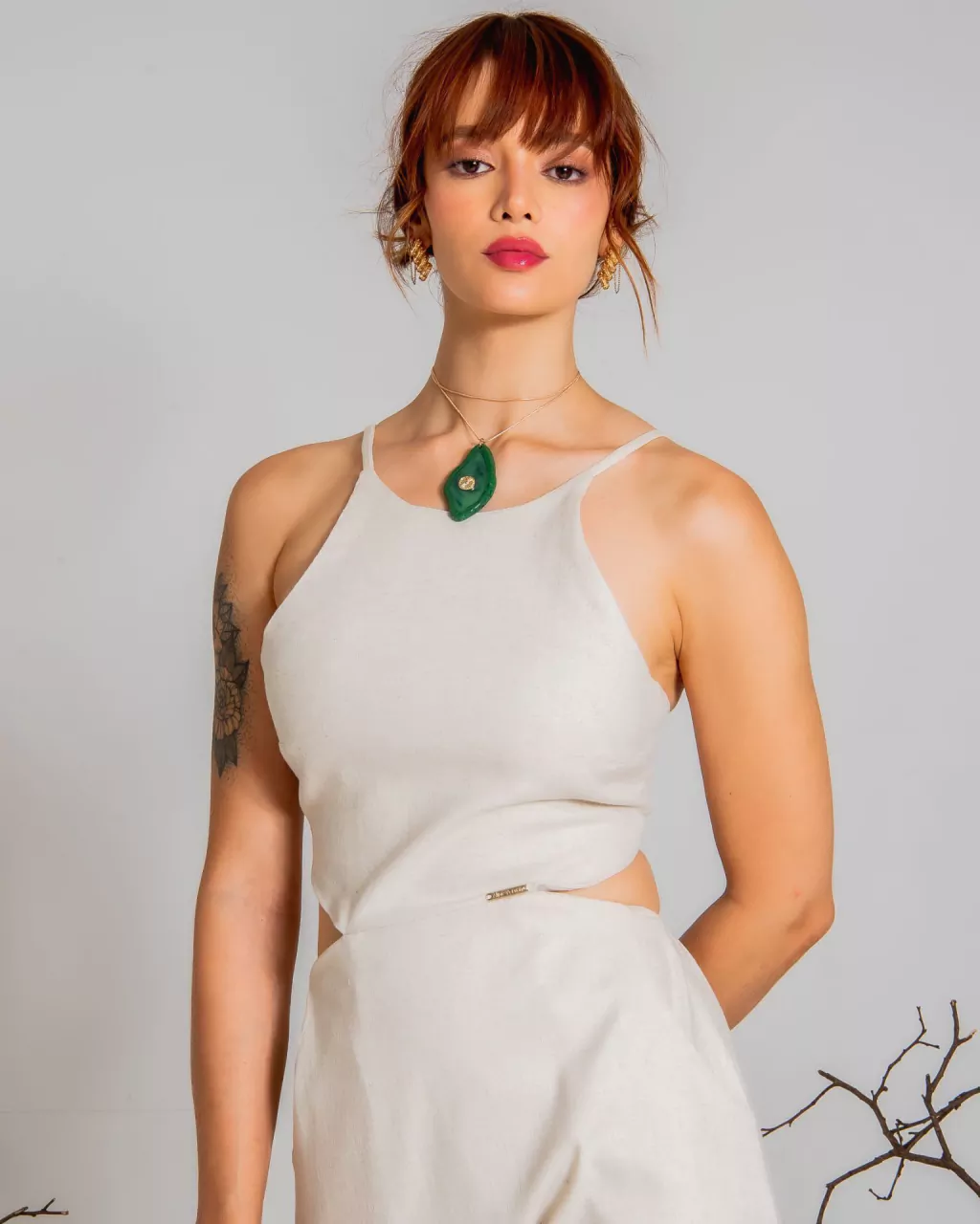 O Vestido Ramos é um vestido midi combina estilo e conforto. Com abotoamento traseiro, alças finas e forro, ele apresenta cores lisas, recortes laterais e bolsos frontais. Disponível em três opções de cores, é ideal para passeios no verão. O tecido de viscolinho (Tecido Plano) é composto por 70% viscose, 27% linho e 03% elastano, proporcionando um toque suave e flexibilidade. Versátil e elegante, o vestido "Ramos" é perfeito para diversas ocasiões.