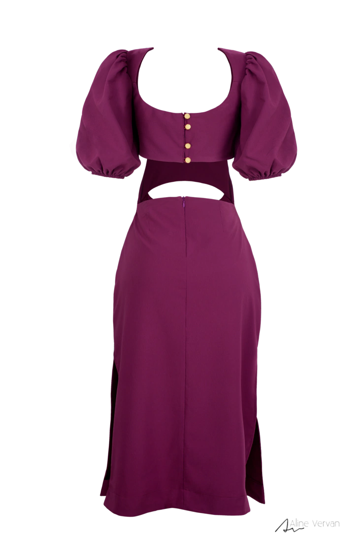 Vestido midi com recortes estratégicos, tanto na parte frontal e traseira da peça. Mangas curtas e levemente bufantes, com aplicação de elastico fino. Fendas laterais e fechamento traseiro com botões de banho dourado. Todo confeccionado em malha de alfaiataria.